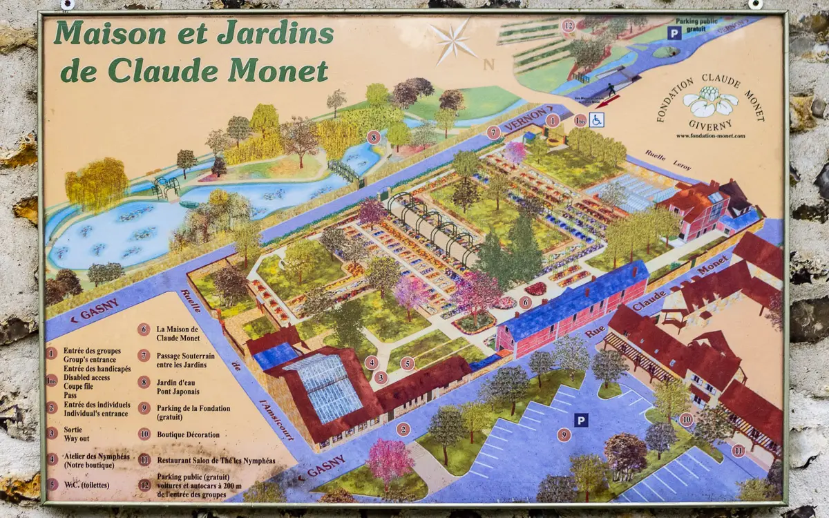 ABOVE: A map near the entrance shows the layout of the Maison et Jardins de Claude Monet. The gardens consist of two parts: The Clos Normand flower garden next to the house, and a Jardin d'Eau or Water Garden with floating water lilies. Click here for a larger map.