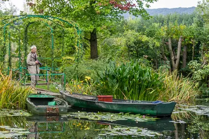 ABOVE: More than a century later, an acquatic gardener tends Claude Monet's pond and its water lilies. (You can see Monet's Japanese-style footbridge in the background.)