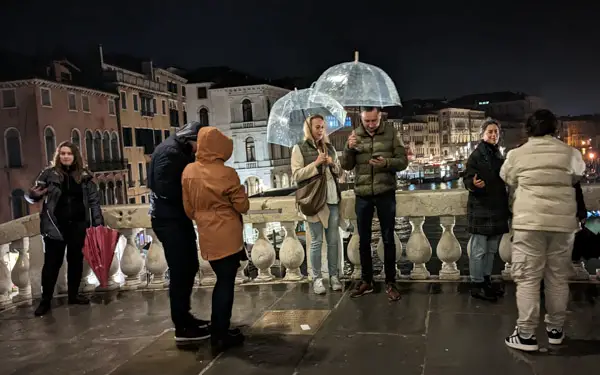 ABOVE: Visitors pose for photos on the Rialto Bridge during a rainy night in November. The Rialto Bridge , a.k.a. Ponte di Rialto, is the best-known bridge in Venice. The current structure dates back to 1591, when it was opened as a permanent replacement for previous bridges (:including a boat bridge) that spanned the Grand Canal. The Ponte di Rialto lies at the midpoint of the Canal Grande and provides a connection between two of the city's busiest pedestrian thoroughfares. BELOW: An Alilaguna Linea Arancio airport boat travels up the Grand Canal after passing under the Rialto Bridge.